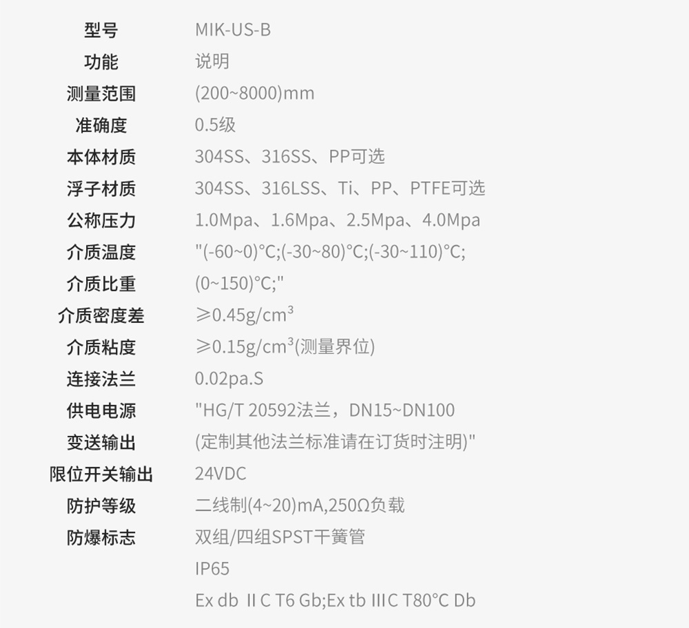 MIK-UZ磁翻板液位计根据浮力原理,浮子在测量筒内随液位的升降而上下移动,浮子内的永久磁钢通过磁耦合作用,驱动红白翻柱翻转 180°,液位上升时,翻柱由白色转为红色,下降时由红色转为白色,从而实现液位的指示。 具有耐腐蚀、稳定性强、易操作的特点,适用于低温到高温、真空到高压等各种环境,是化工溶液等场合理想的液位测量产品。