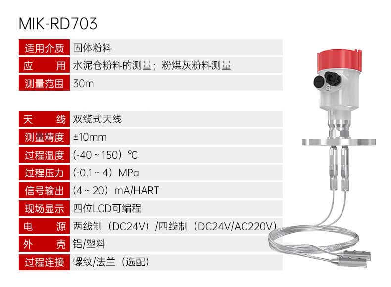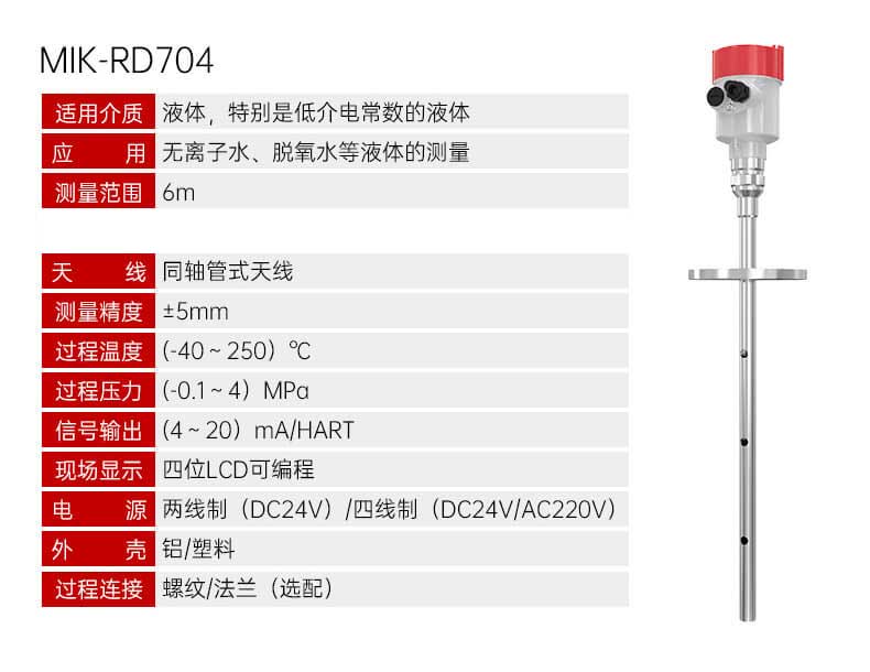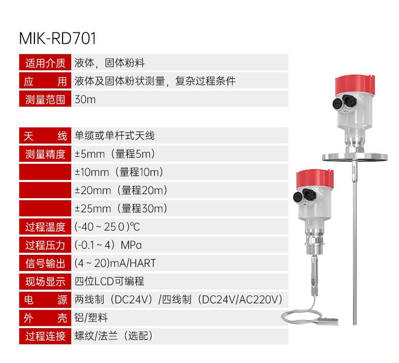 由于采用了先进的微处理器和独特的 Echo Discovery 回波处理技术, 导波雷达物位计可以应用于各种复杂工况。 多种过程连接方式及探测组件的型式,使得 MIK-70系列导波雷达物位计适用于各种复杂工况及应用场合。如:高温、高压及小介电常数介质 等。 采用脉冲工作方式,导波雷达物位计发射功率极低,可安装于各种 金属、非金属容器内,对人体及环境均无伤害